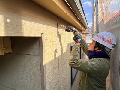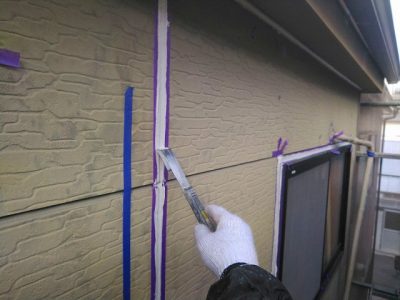 シーリング材がサイディングを汚さないようにマスキングテープで養生したら、密着性を高める専用の下塗り材(シーラー)を刷毛で塗ります。