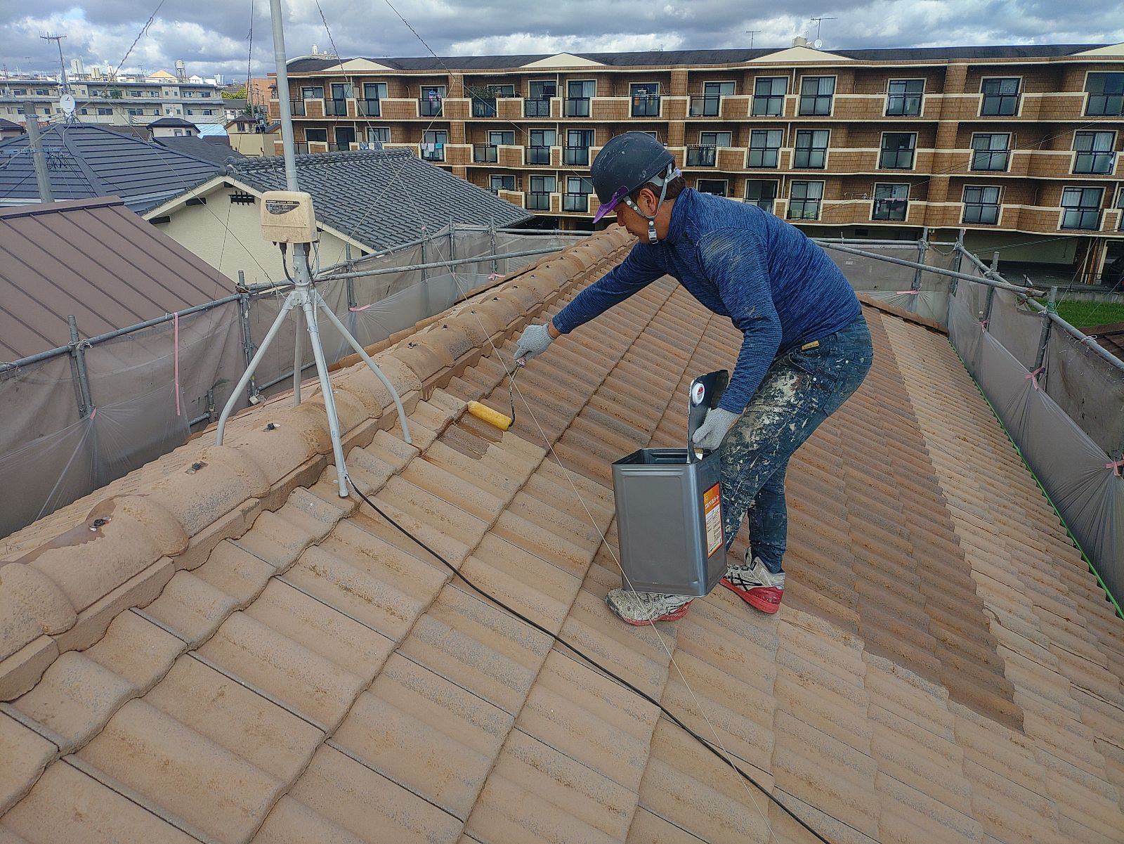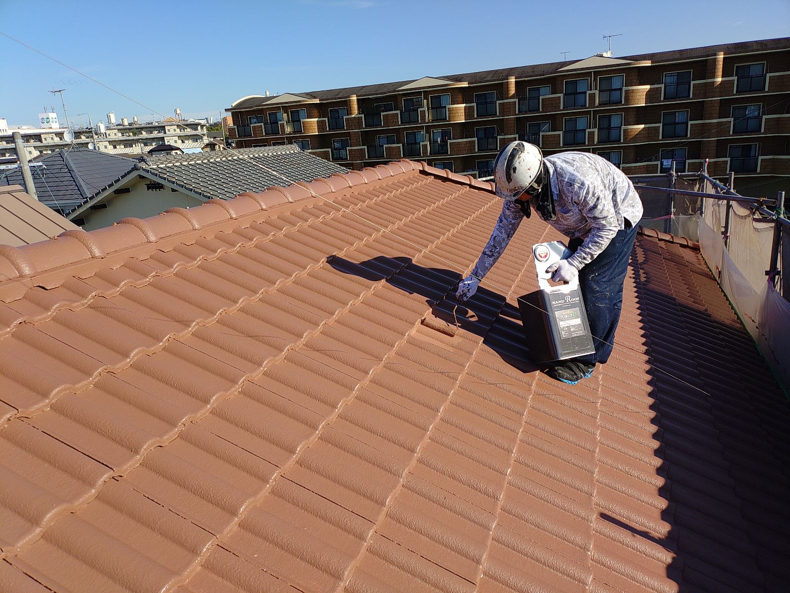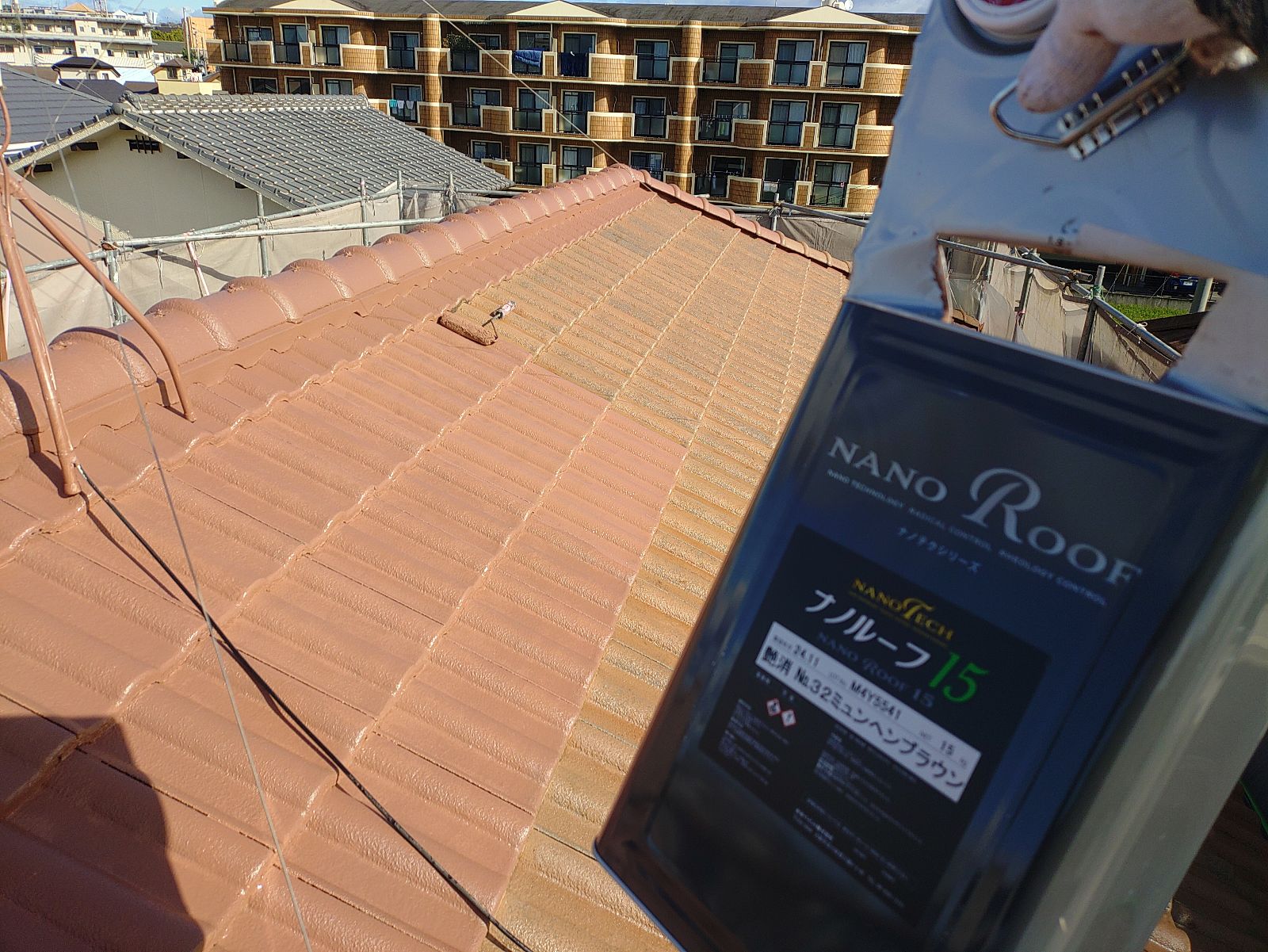 【施工中】屋根-中塗り:ナノルーフ15はシリコン樹脂塗料でも高級シリコンを使用した高耐久塗料!