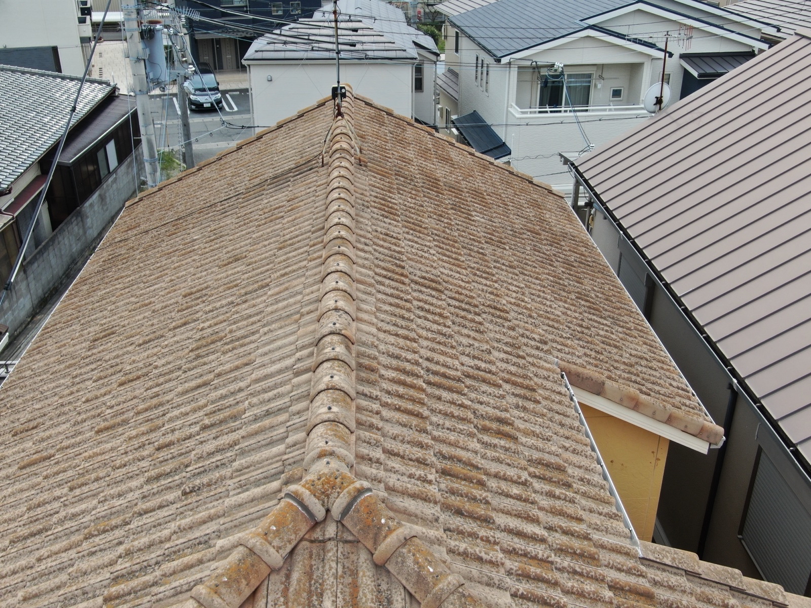 【施工前】屋根:防水性が失われて、全体的にカビや藻が発生しています。