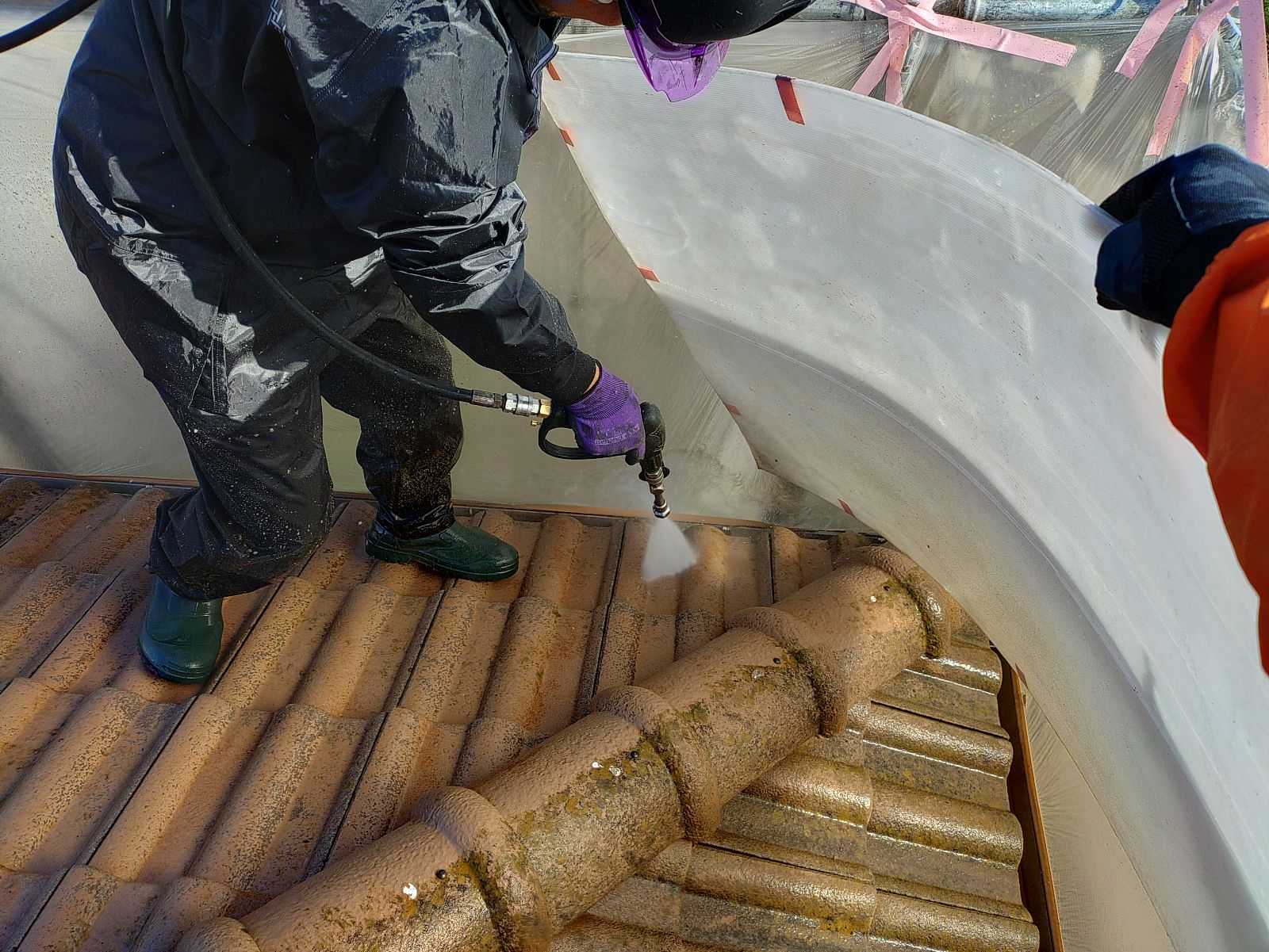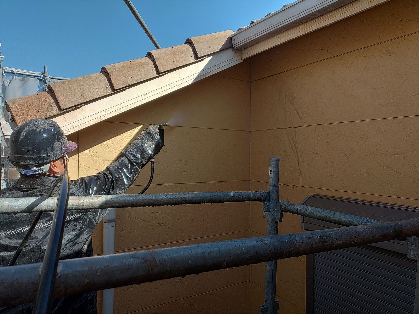 【施工中】高圧洗浄:チョーキング・汚れ・苔などを洗い流していきます。