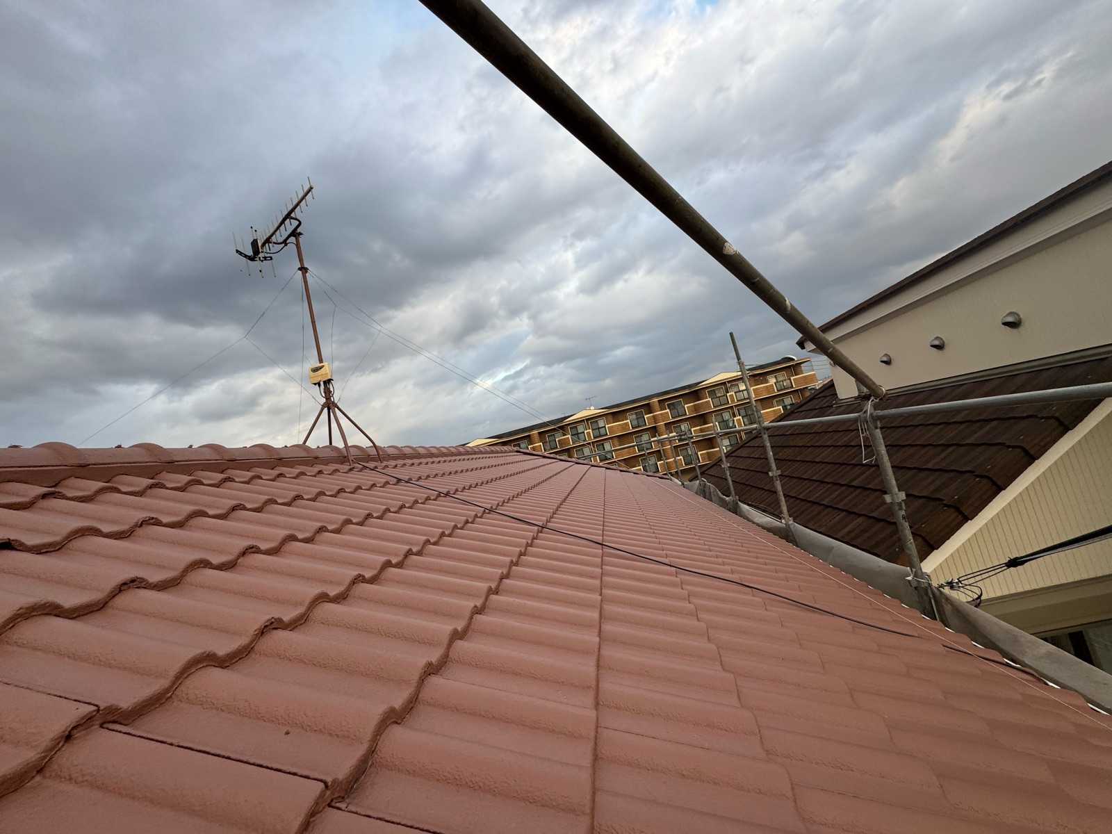 【施工中】屋根-上塗り:色はナノルーフ標準色のミュンヘンブラウンです。
