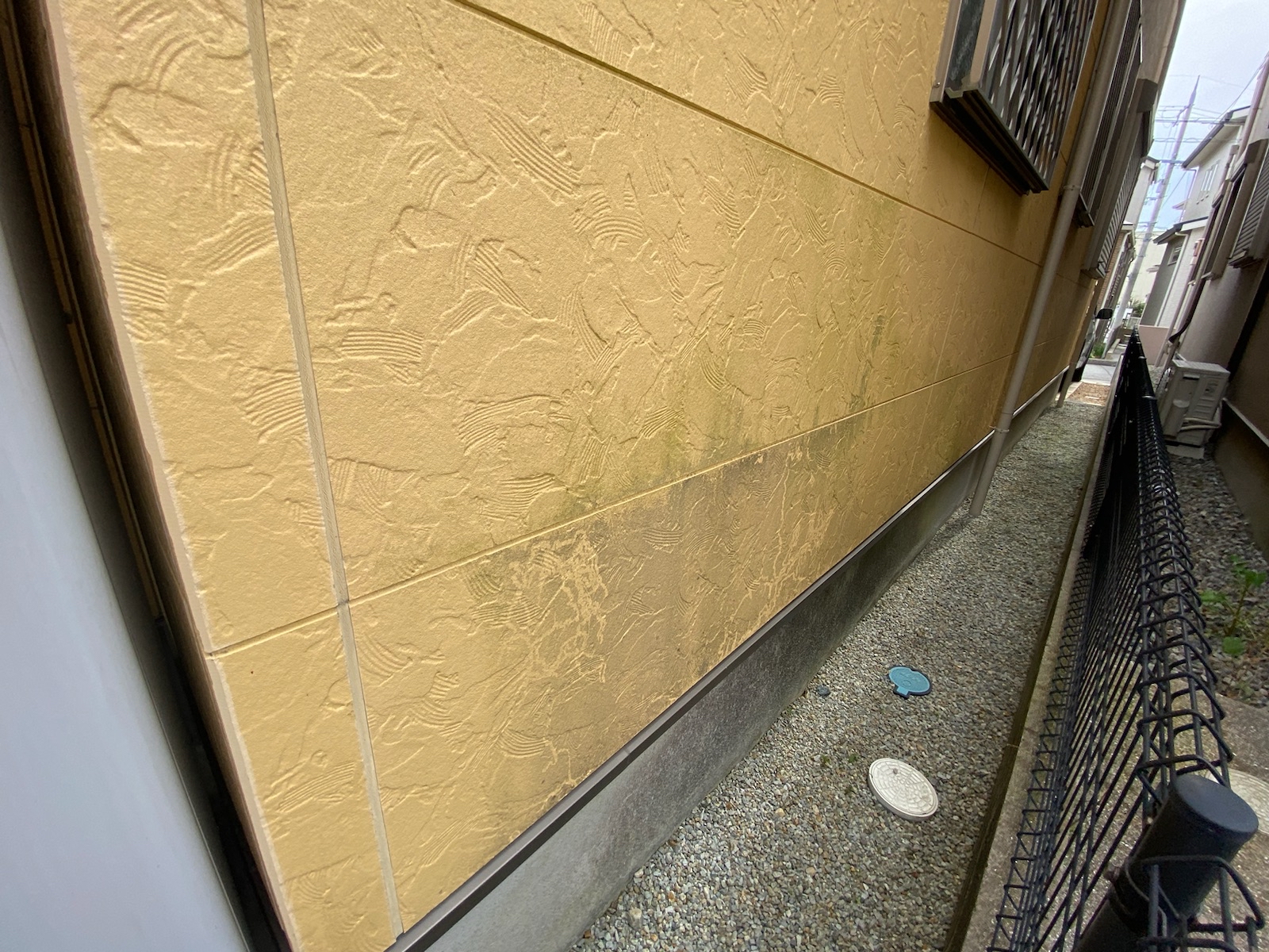 【施工前】外壁アップ:塗料の防水性が低下し、カビが発生しています。