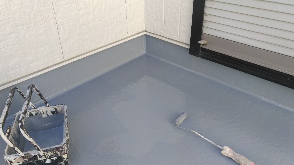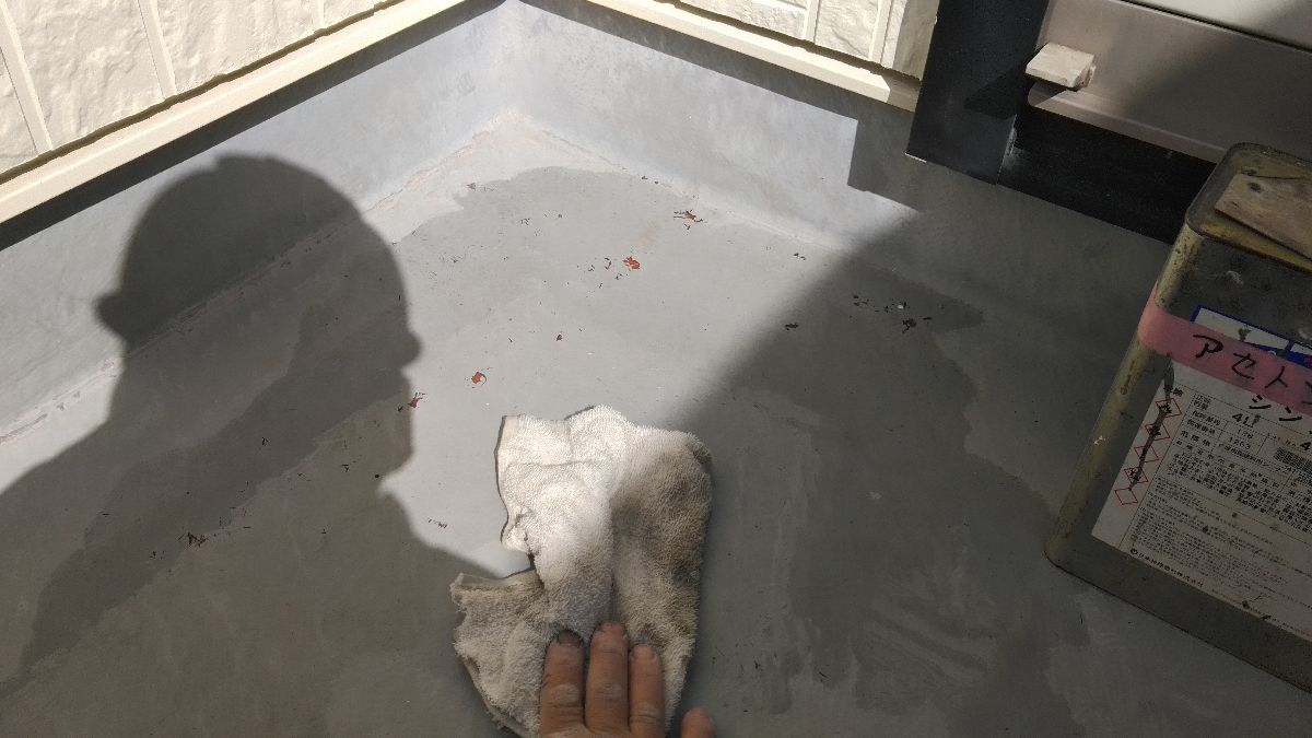【施工中】バルコニー防水:旧塗膜の除去・掃除を行ってから塗装します。