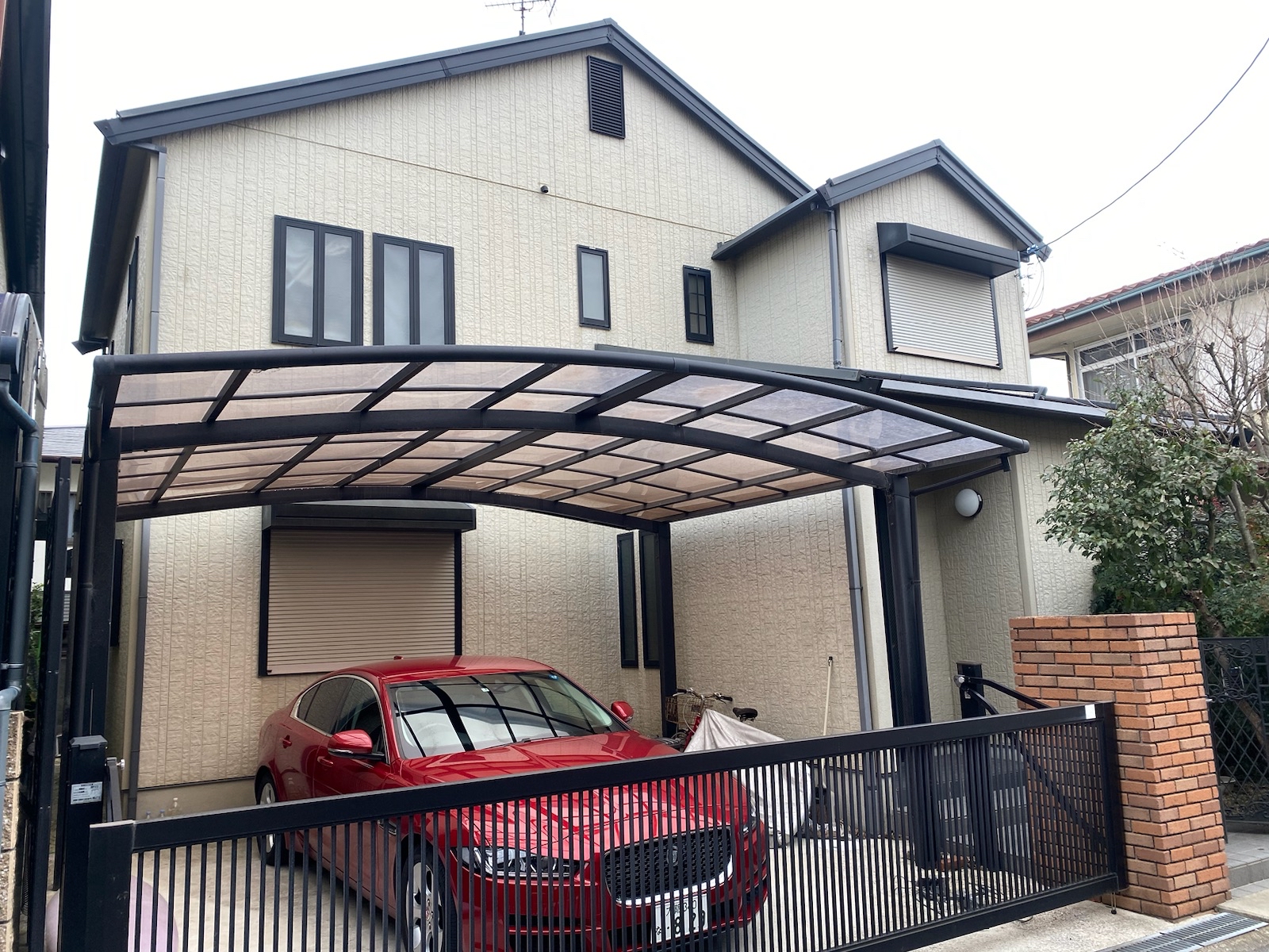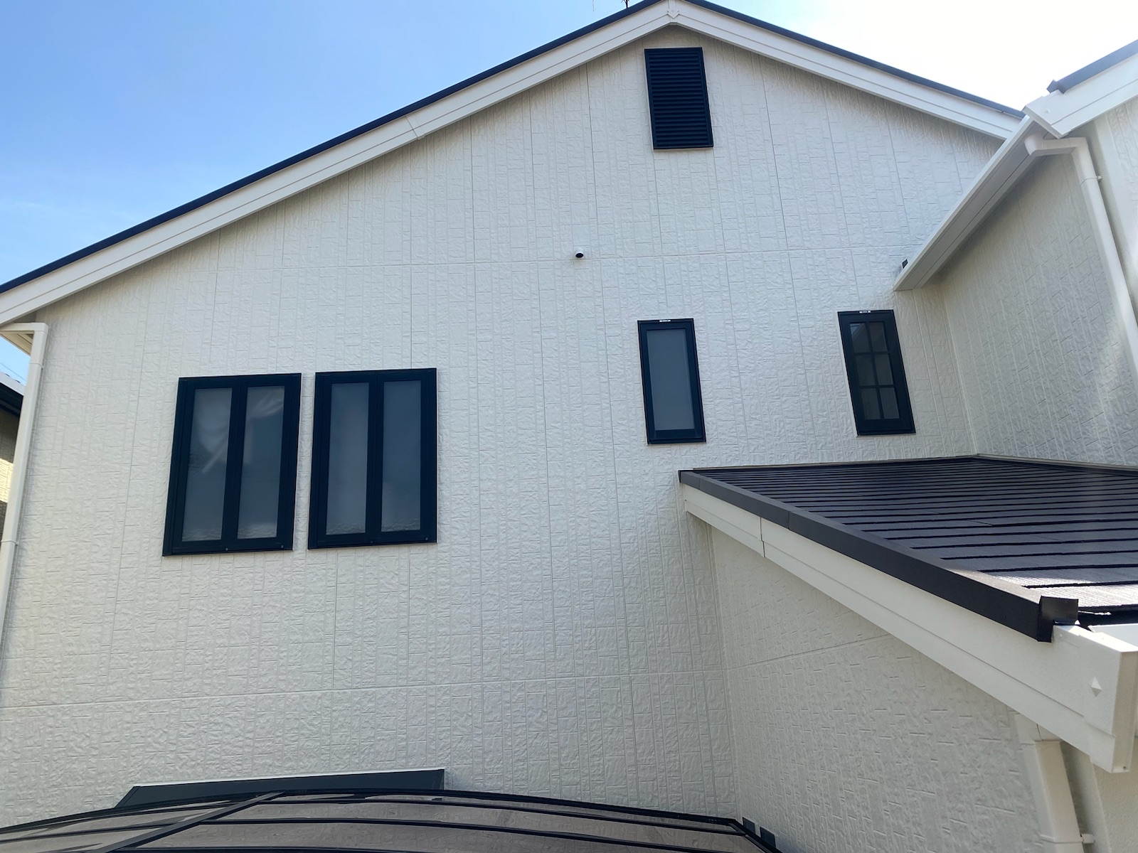 【施工中】外壁-中塗り:少しクリーム色ですが、全体を見るとかなり白く見えます。