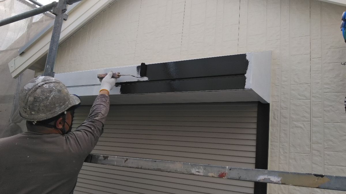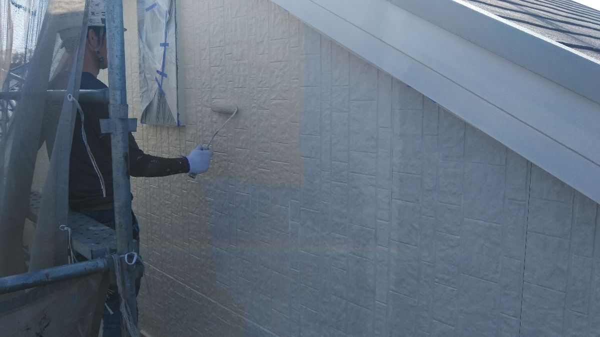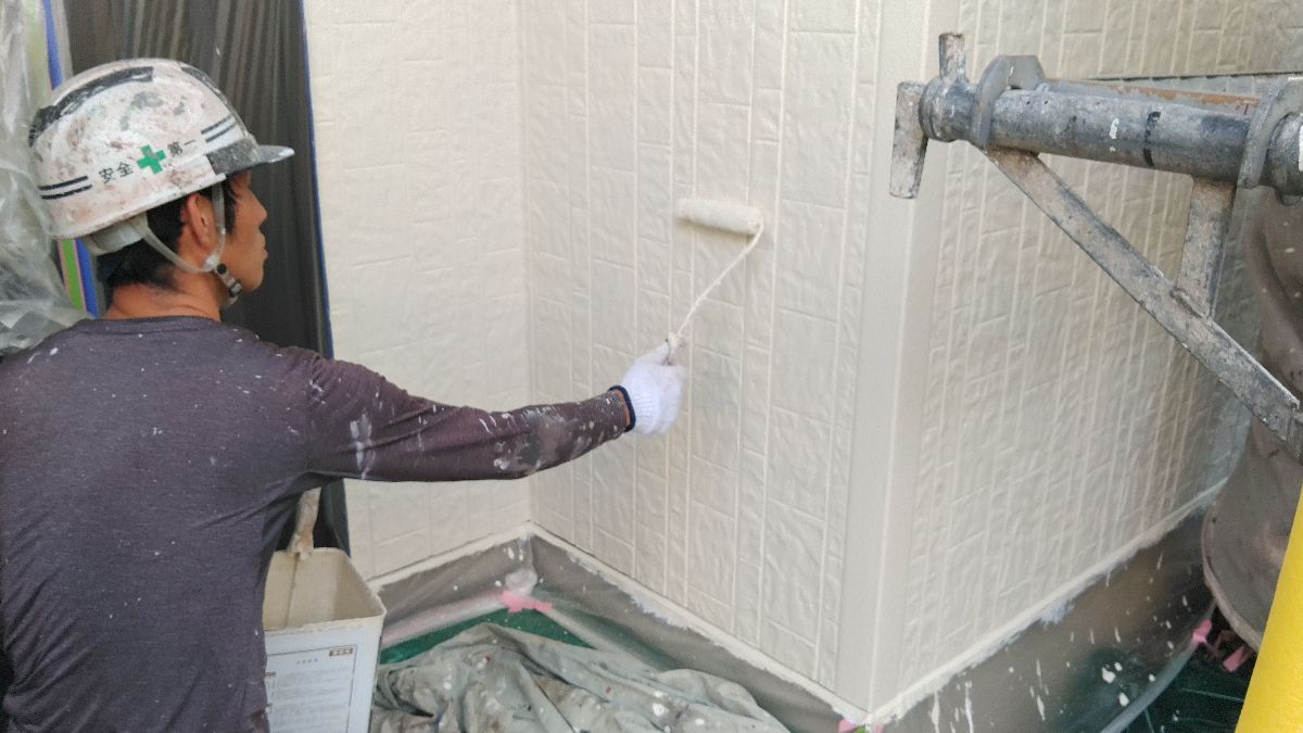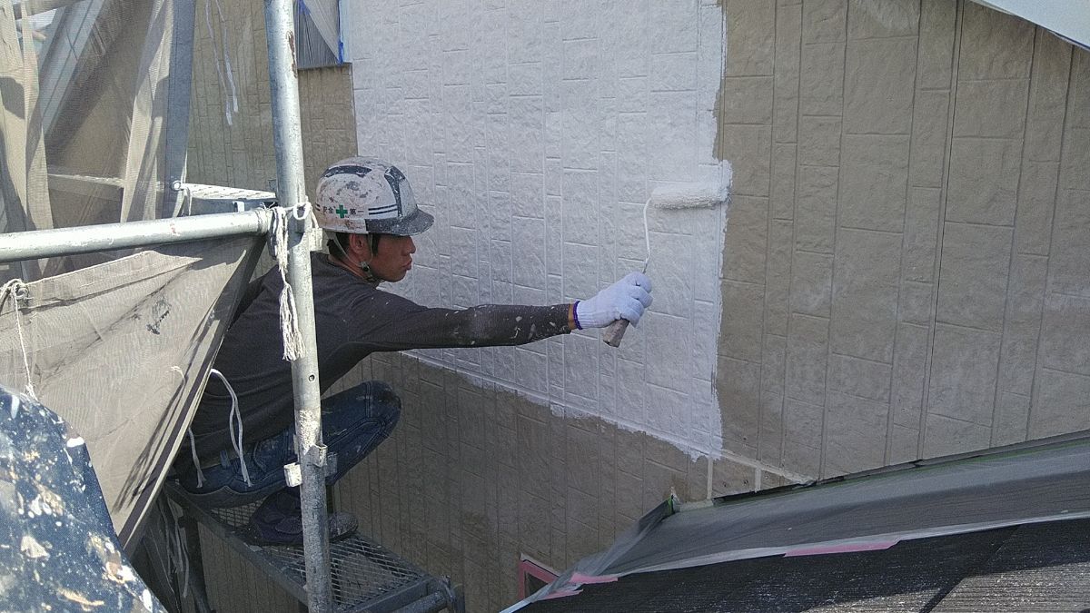 【施工中】外壁-上塗り:エスケーのプレミアムシリコンは白色塗料の弱点のチョーキングを長期的に起こさないように開発された商品です。