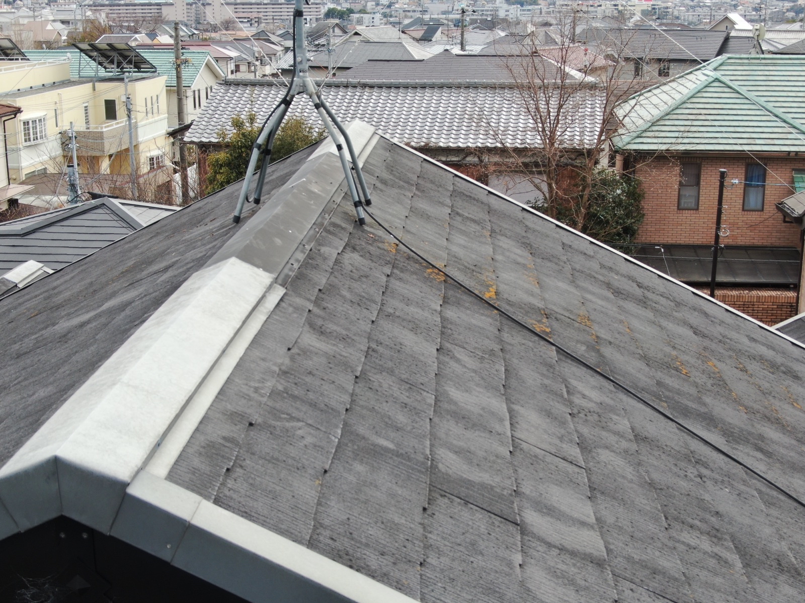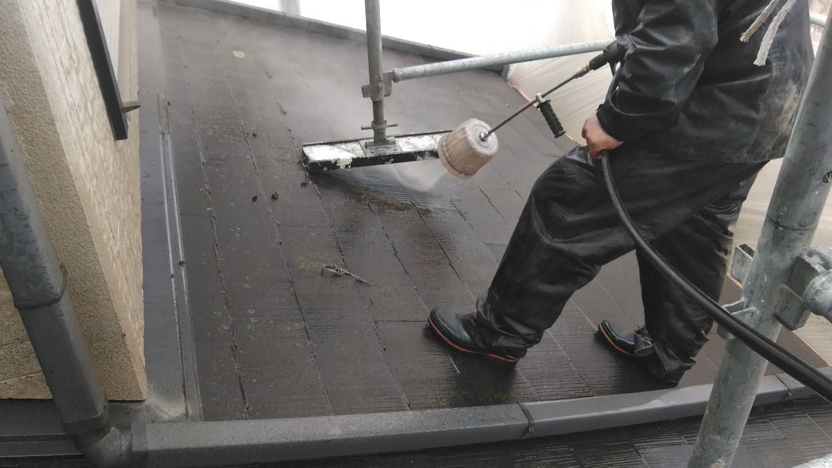 【施工中】高圧洗浄-屋根:汚れ・旧塗膜も流します。