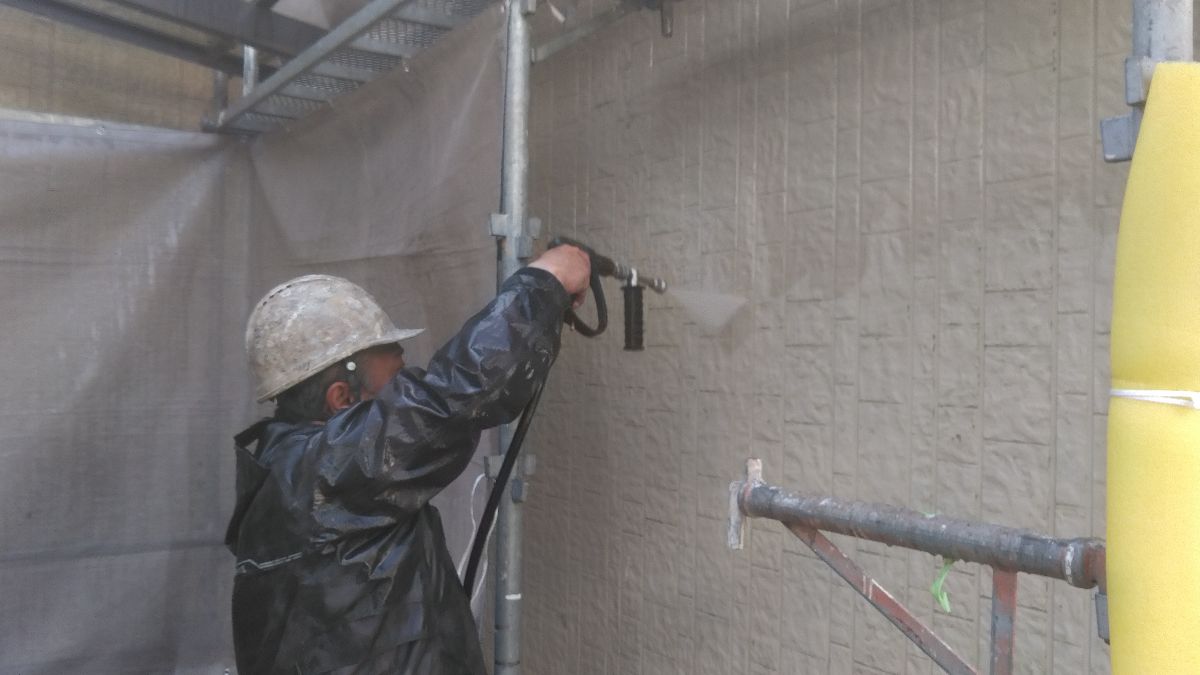 【施工中】高圧洗浄-外壁:上から下に汚れを流していきます。